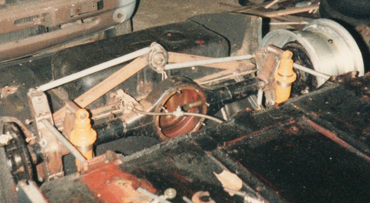 This replaced the links and quarter eliptic on a frog with 4 rose jointed rods and adpatation of a watts linkage, normal with a watts linkage the swivel would but mounted on the axle casing and the rod ends fixed to the chassis. A panhard rod could have been used but with that the axle would move sideways and the geometry would always be changing.